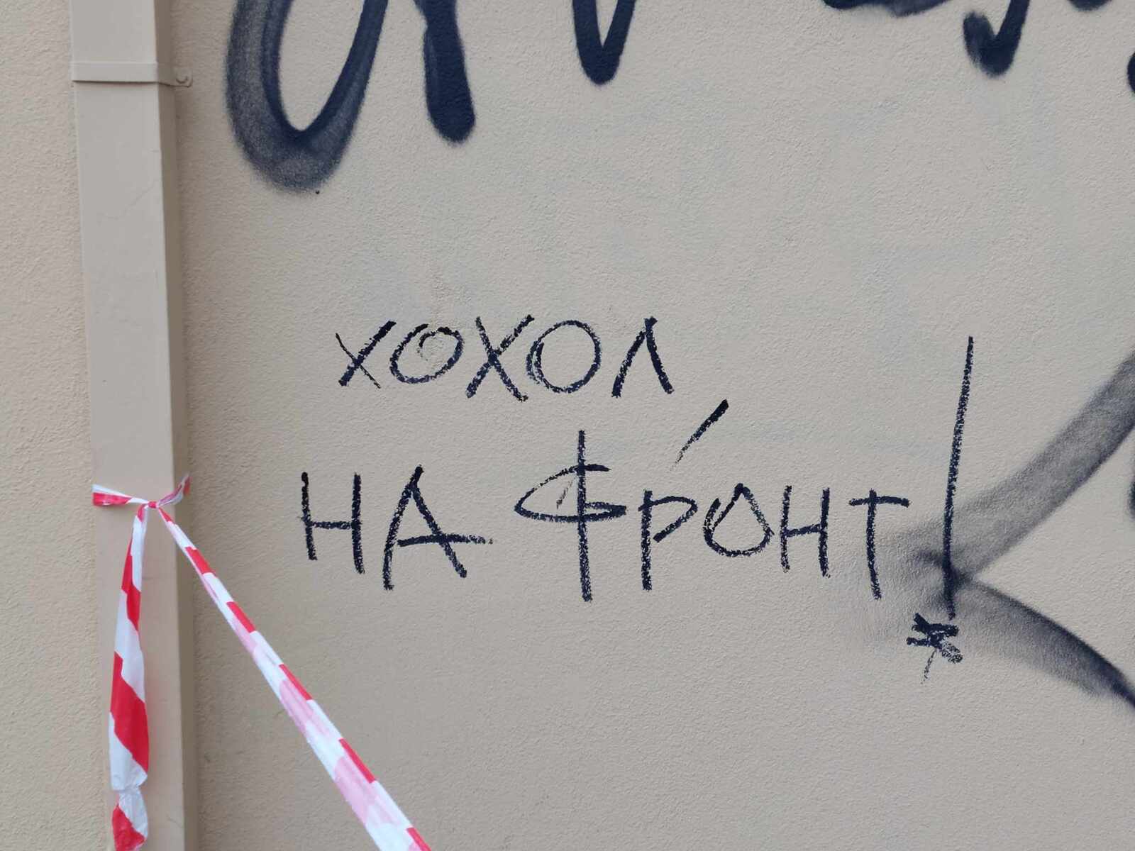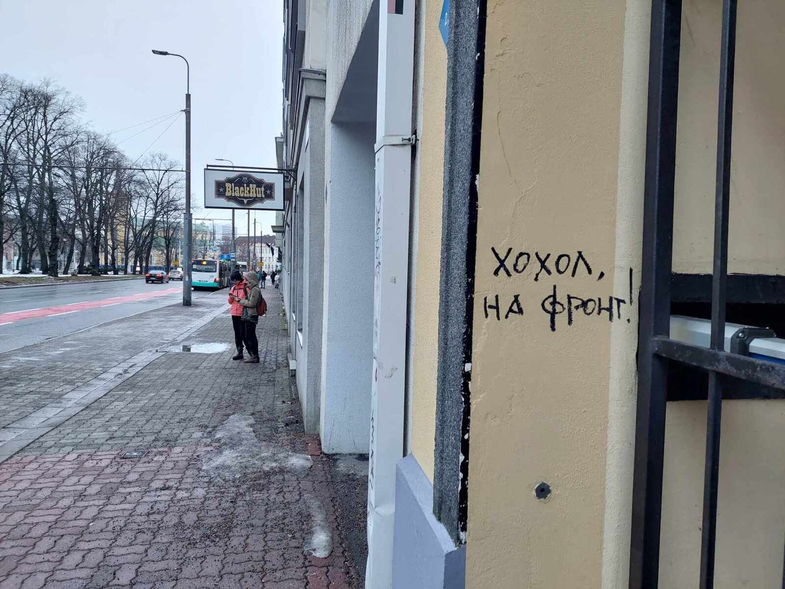 Seintele on markeriga kritseldatud "хохол на фронт", mis tähendab halvustavas toonis ukrainlast ja seda, et too peaks rindele minema, mitte Eestis viibima. Võib ette kujutada kui häirivad on sellised sõnumid hetkel Eestis viibivatele ukrainla põgenikele. Samas, küllap nad teavad, Kremli eriteenistuste kombitsad ulatuvad ka siia. Meeles tuleb pidada, et Ukraina põgenikud on Eestise tulnud Kremli kurjategijate põhjustatud räige vägivalla ja terrori eest ja toosama Kremli seltskond üritab nüüd sisekonflikti käivitada. Kui see on parim, mida putinoidid suudavad, siis on katse sama hale nagu hiljuti ilmavalgust näinud venelaste "Tesla tapja" elektriauto Amber. Loodetavasti pestakse seinad võimalikult kiiresti puhtaks.