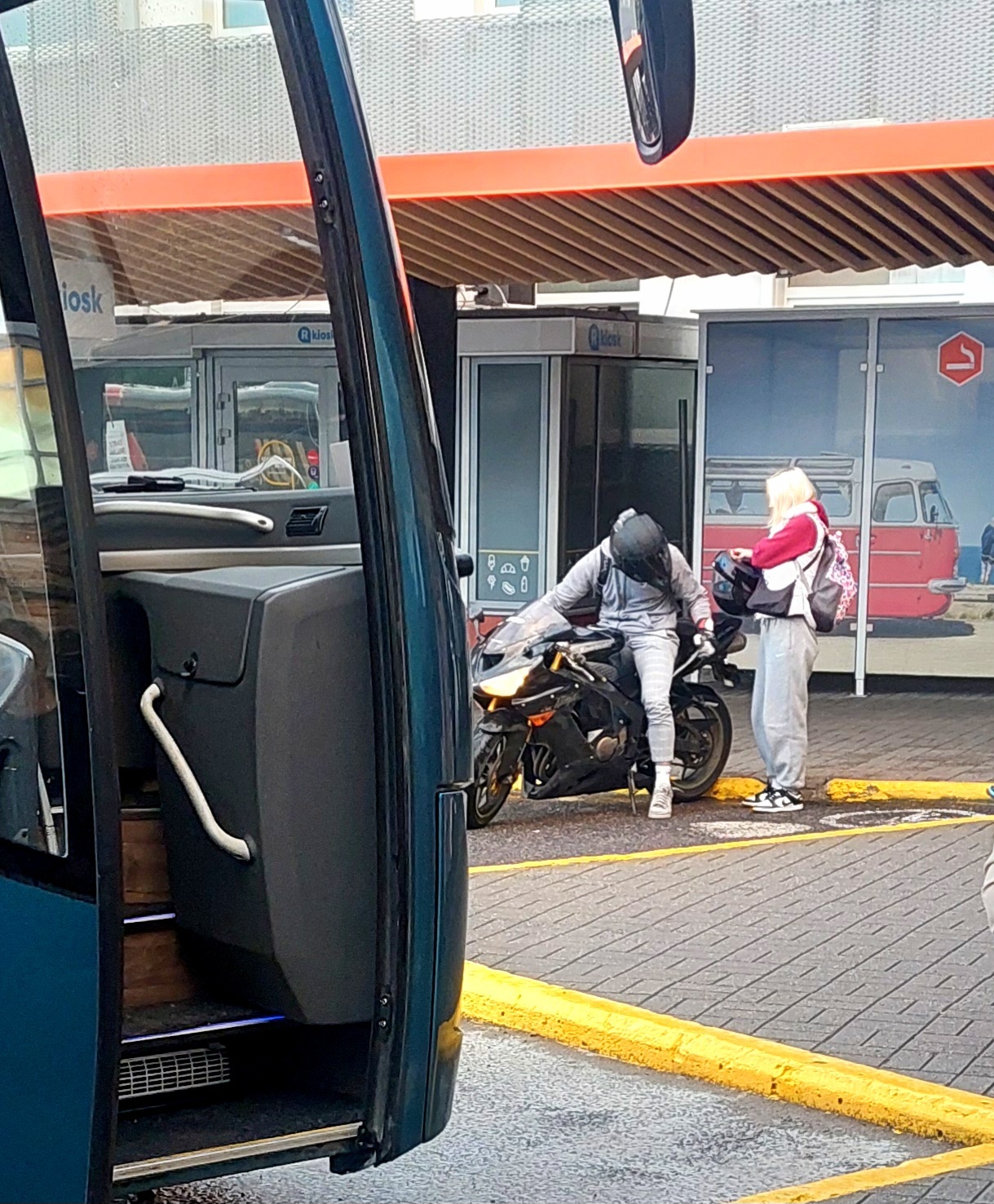 „Olen kindel, et Tallinna bussijaama paviljonide esine ala on ainult bussidele liiklemiseks ja parkimiseks mõeldud, „kirjutab vihjesaatja. „See ei seganud aga mootorraturit, kes rahumeeli keelatud alale põristas ja keset platsi seisma jäi. Kohe ilmus välja ka G4S turvamees, kes motikamehega sõnelema asus. Too turvamees meenutas kõvasti näitleja Jason Sathamit, välja arvatud suurus. Turvamees tundus olevat nagu Stathami 1:2 mudel – kaks korda väiksem.”