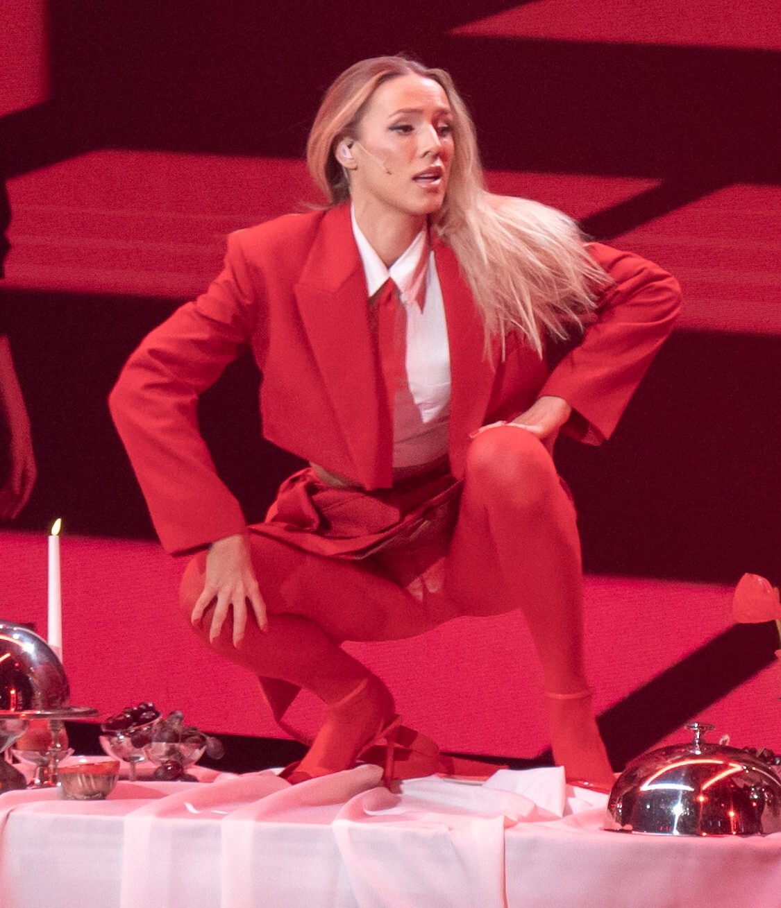Liis Lemsalu vägev show sisaldas endas peolaua taga esinemist. Ühel hetkel kargas aga näitsik nii agaralt valge linaga kaetud lauale, et onuheinod oleks omale süldi kurku läkastanud! Õnneks oli laua taga peoliste asemel taustatantsijad. Hoogu läinud lauljatar ei varjanud ühtlasi oma seelikualust.