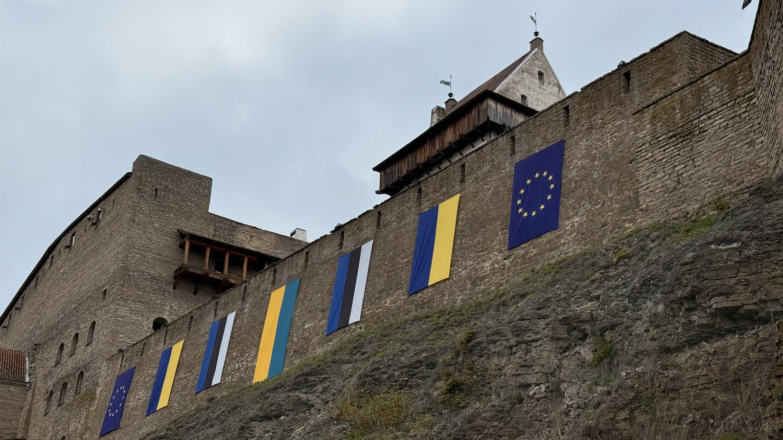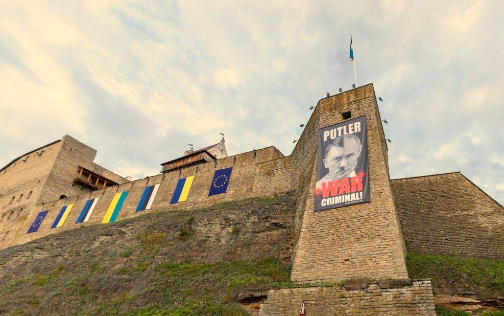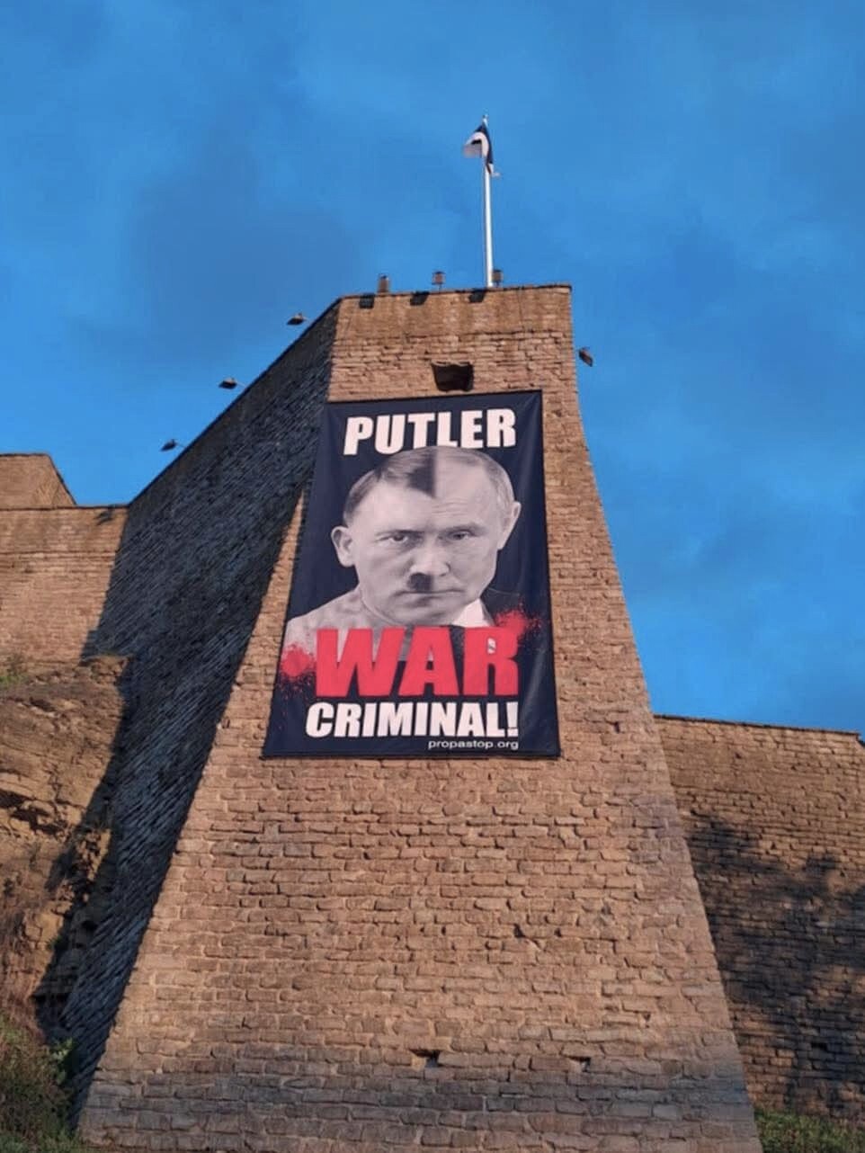 Border city Narva, Estonia — in a strong narrative pushback act, Narva Museum has installed a massive poster featuring a joint portrait of Vladimir Putin and nazi dictator Adolf Hitler on the wall of the Hermann Castle facing the Russian border — just in time for May 9th, known in Russia as victory day. EU, Estonian and Ukrainian flags are also presented.